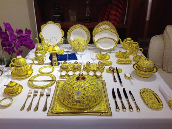 Mỗi vật dụng trên bàn ăn đều sử dụng vật liệu sứ theo công nghệ Anh, các họa tiết trang trí được chế tác tinh xảo và mô phỏng theo các hoạ tiết trang trí trong cung đình Trung Quốc xưa.