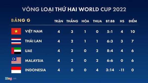 Reuters cho biết Việt Nam đang dẫn đầu bảng G với 10 điểm sau 4 trận đấu. Thái Lan rơi xuống vị trí nhì bảng vì thua Malaysia 1-2. Chiến thắng trên sân nhà giúp thầy trò HLV Tan Chang Hoe tiếp tục hy vọng giành suất vào Vòng loại thứ ba World Cup 2022.