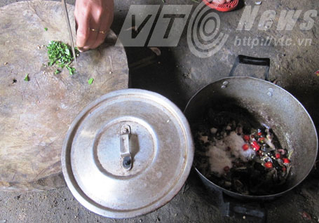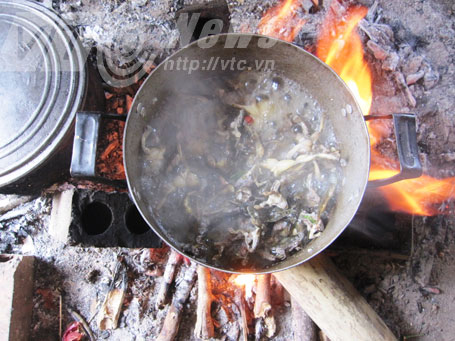 Những con nhái được rửa sạch, cho vào nồi nhôm đáy đen muội bếp. Mẻ, muối, một chút rau thơm và rất nhiều ớt được trộn lẫn. Thêm một chút nước. Rồi đặt lên ba ông đầu rau, chất củi khô đốt.