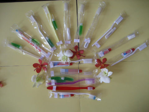 Trong vai người đi tìm nguồn hàng kem và bàn chải đánh răng để phục vụ trong một nhà nghỉ sắp khai trương, chúng tôi hỏi mua loại kem đáng răng dùng trong khách sạn, không hẹn mà gặp, các chủ sạp đều đưa ra một bịch gồm khoảng một trăm tuýp kem đánh răng nhỏ, màu xanh. Tất cả chúng đều kèm theo bàn chải đánh răng, đúng loại chúng tôi cần tìm hiểu. Mỗi tuýp kèm bàn chải như vậy có giá từ 400 đến 600 đồng.