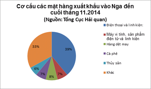 Việt Nam xuất vào Nga nhiều nhất là cá tra (hơn 50% tổng giá trị), ngoài ra còn có cá khô, tôm, bạch tuột, cá thu và cá ngừ. Đến cuối tháng 11/2014, Mỹ vẫn là thị trường xuất khẩu lớn nhất của ngành thủy sản, kế đến là châu Âu. Chỉ hai thị trường này đã chiếm khoảng 40% tổng giá trị xuất khẩu thủy sản của Việt Nam.