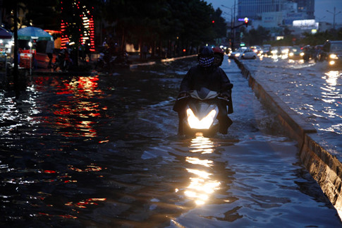 Chiều 18.9, một cơn mưa lớn bắt đầu vào khoảng 16 giờ đã làm cho một số con đường ở Q.Bình Thạnh, Q.2 bị ngập nặng, người dân lội nước một cách khổ sở. Khách Tây còn lấy phao ra bơi và tắm.