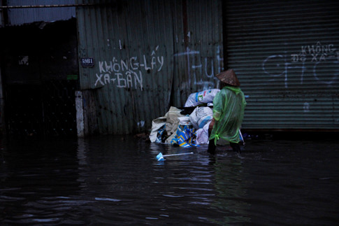 Cảnh ngập sâu làm nhiều xe chết máy ở đường Nguyễn Văn Hưởng và các bạn du khách Tây đem phao ra bơi