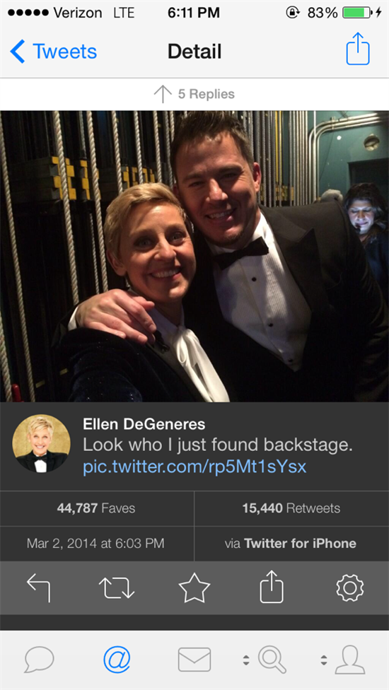 Sau đó, cô lại dùng Note 3 để chụp ảnh “tự sướng” tập thể cùng dàn diễn viên tài năng đang ngồi hàng ghế khán giả như Bradley Cooper, Jennifer Lawrence, Kevin Spacey… Lần này, với sự trợ giúp của Cooper, bức ảnh có chất lượng tốt hơn nhiều và thậm chí còn trở thành tin tweet được đăng lại nhiều nhất lịch sử Twitter.