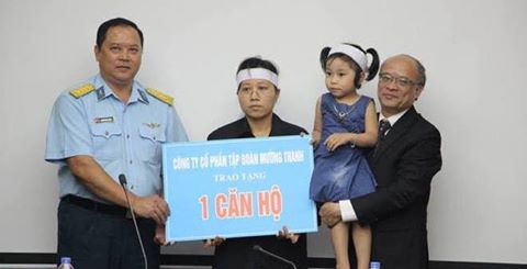 Bức ảnh khác là cảnh vị đại diện Công ty cổ phần Tập đoàn Mường Thanh với khuôn mặt tươi tắn bế cô con gái nhỏ của phi công Khải trong buổi trao tặng căn hộ cùng với tấm biển to đùng, nổi bật dòng chữ là thương hiệu của Tập đoàn này.