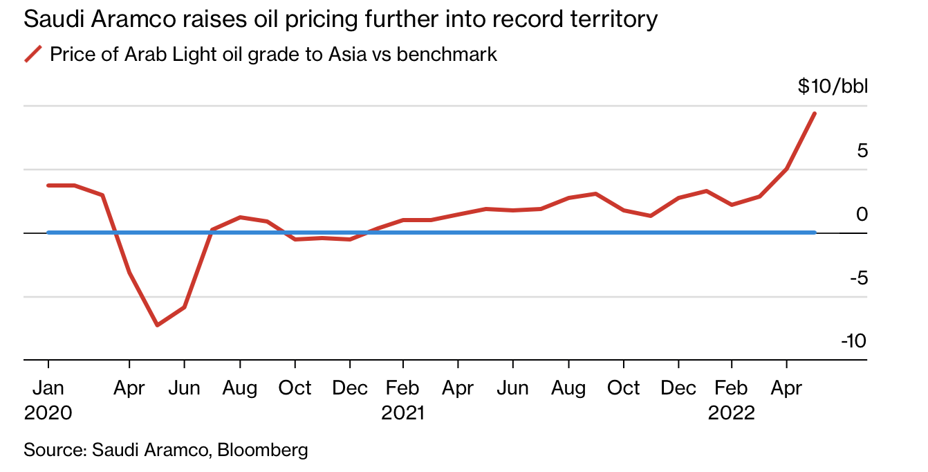 Tập đoàn dầu mỏ quốc gia Saudi Aramco (Ả-rập Xê-út) vừa quyết định tăng giá bán dầu thô loại Arab Light cho khu vực châu Á trong tháng 5/2022 thêm tới 9,35 USD/thùng so với mức giá tiêu chuẩn hiện nay. Đây là mức tăng giá cao nhất của Saudi Aramco từng được ghi nhận; trước đó, trong tháng 4/2022, Saudi Aramco chỉ tăng giá bán dầu thô thêm 4,40 USD/thùng.