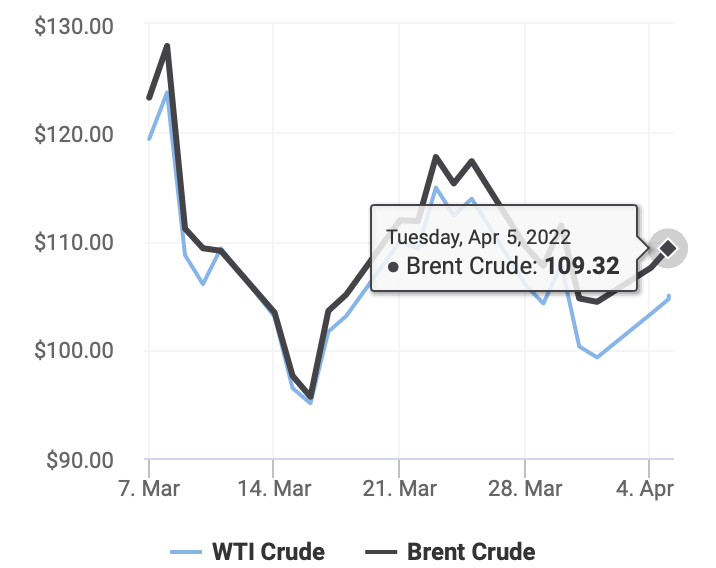 Giá dầu thô thế giới đang có xu hướng tăng giá trở lại sau khi điều chỉnh giảm mạnh tuần trước. Cụ thể, vào lúc 14h00 ngày 5/4 (theo giờ Việt Nam), giá dầu thô Brent giao tháng 5/2022 đã tăng 1,68% lên 109,32 USD/thùng; giá dầu thô ngọt nhẹ Texas (WTI) giao tháng 5/2022 cũng tăng 1,61% lên 104,94 USD/thùng.
