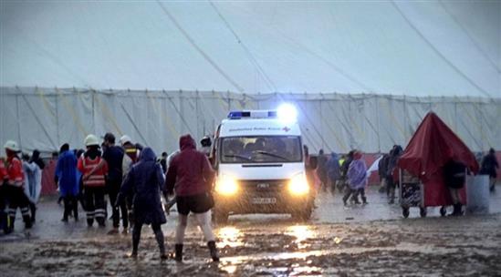 Lực lượng cứu hộ sơ cứu một người đàn ông bị sét đánh tại đại nhạc hội "Rock am Ring" ở Đức chiều tối 3.6 sau khi bão quét qua nơi tổ chức sự kiện này