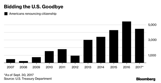 Số lượng người Mỹ từ bỏ quốc tịch qua các năm. Ảnh: Bloomberg.