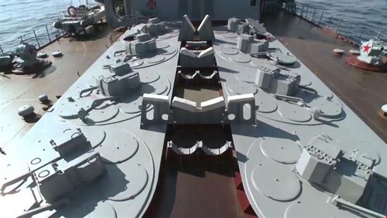 Tổ hợp tên lửa phòng không S-300F "Fort" trên tuần dương hạm Cận vệ “Matxcơva” ngoài khơi bờ biển Latakia.