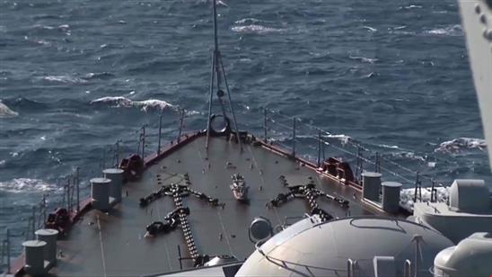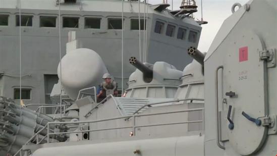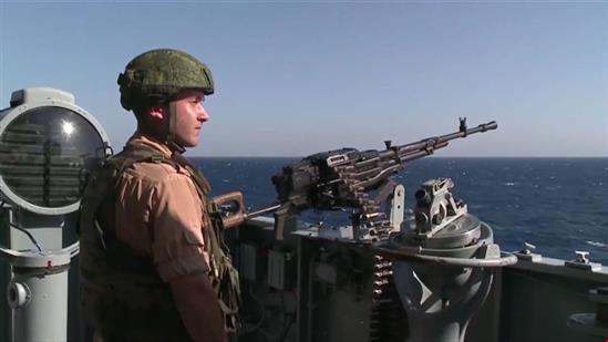 Quân nhân Nga trực chiến cảnh giới trên tuần dương hạm tên lửa Cận vệ “Matxcơva” ngoài khơi bờ biển Latakia