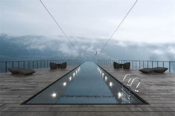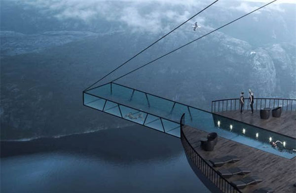Một trong những thứ gây ấn tượng nhất trong công trình tương lai này chính là chiếc hồ bơi ngoài trời khổng lồ kéo dài từ giữa vách đá ra tận bên ngoài vô cùng cheo leo, nguy hiểm. Chiếc hồ bơi này được xây hoàn toàn bằng kính trong suốt và cố định bởi một sợi dây cáp dài. Khi bơi trong đây, du khách có cơ hội thu vào tầm mắt cả vực sâu ngay dưới chân mình vô cùng thú vị và rùng rợn!