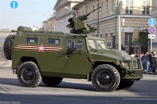 Trong ảnh là xe bọc thép Tigr-M với giá điều khiển vũ khí tự động Arbalet-DM. Tổ hợp vũ khí tự động này có trọng lượng 250kg, lắp đại liên 6P49 Kord 12,7mm có tốc độ bắn đến 600 phát/phút, tầm bắn 2.000m ban ngày và 1.500m ban đêm. Trên giá pháo được trang bị hệ thống ngắm với camera TV ánh sáng thấp.