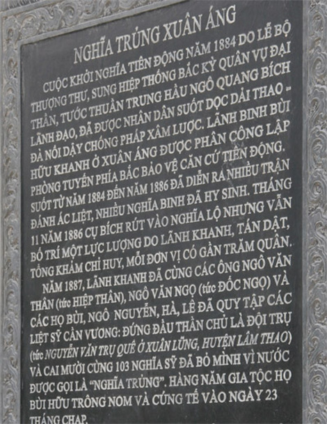 Trong gia phả của họ Bùi ở làng Xuân Áng, huyện Hạ Hòa, tỉnh Phú Thọ có ghi chép rõ ràng về quá trình cùng tháng năm lập mộ Nghĩa Trủng. Đây được xem là ngôi mộ tập thể 103 nghĩa sĩ Cần Vương.