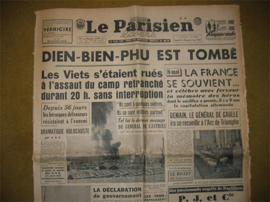 Trang nhất tờ Le Parisien libéré số ra ngày 8/5/1954 chạy dòng tít lớn: "Điện Biên Phủ thất thủ."