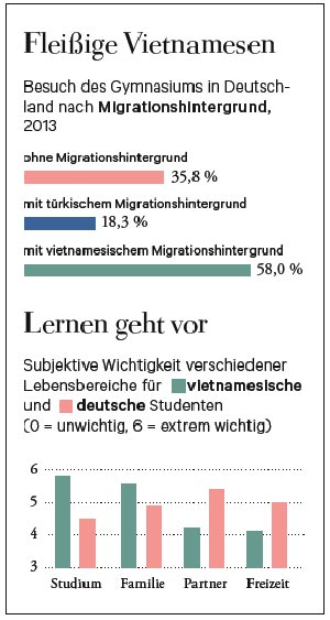 Biểu đồ thứ nhất (ở trên) với tiêu đề “Người Việt Nam chăm chỉ” nêu con số thống kê toàn quốc ở Đức năm 2013 về tỷ lệ học sinh tham gia hệ tú tài (Gymnasium) trên từng nhóm dân cư, trong đó ở nhóm “không có nguồn gốc nhập cư” là 35,8 %, ở nhóm “có nguồn gốc nhập cư Thổ Nhĩ Kỳ” là 18,3 % và ở nhóm “có nguồn gốc nhập cư Việt Nam” là 58,0 %.