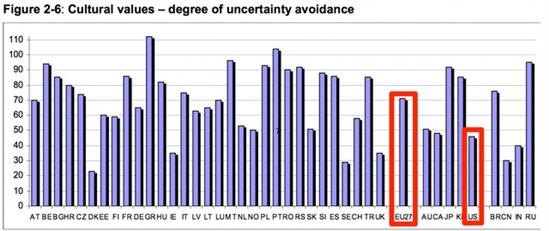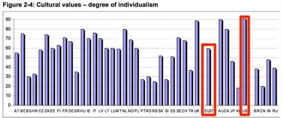 Theo tự nhiên, đáng lẽ người Châu Âu phải có một thái độ tích cực hơn, đồng thời chịu khó học hỏi, đổi mới theo tinh thần kinh doanh của Mỹ, thế nhưng, mọi chuyện dường như lại đi ngược lại với lý thuyết. Theo đó, trong khi người Mỹ ngày càng tỏ ra năng động hơn, thì người Châu Âu lại ngày càng bảo thủ, hãy nhìn vào những biểu đồ được Ủy ban Châu Âu công bố: