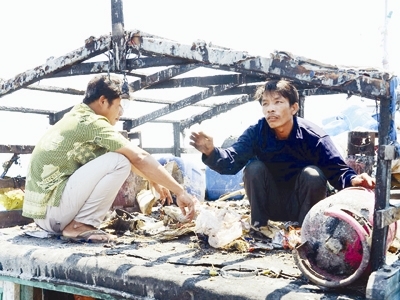 Tàu cá tan hoang, đồ dùng sinh hoạt, ngư cụ... tả tơi, cháy đen là những hình ảnh mà PV Tiền Phong trực tiếp chứng kiến, ghi lại trên tàu cá của anh Phải bị tàu của Trung Quốc nổ súng.