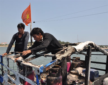 Ngày 24 – 3, tàu QNg 96382 do Bùi Văn Phải làm chủ tàu và Phạm Quang Thạnh làm thuyền trưởng đã cập cảng Sa Kỳ (Bình Châu – Quảng Ngãi) để sửa chữa tàu sau khi bị tàu Trung Quốc bắn cháy cabin gây thiệt hại nặng. Tuy nhiên, may mắn là các bình gas chưa kịp phát nổ. Ảnh: Nguyễn Thành .