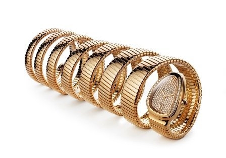 Tương tự, nằm trong những chiếc đồng hồ sành điệu và đẳng cấp thiết kế cho năm Rắn, chiếc đồng hồ Bulgari Serpenti được làm từ những sợi bọc thép hoặc vàng, có độ đàn hồi để có thể cuốn quanh cổ tay, mặt đồng hồ một số chiếc được nạm kim cương, một số mẫu đặc biệt cao cấp được nạm đá quý, sẽ phải mở “miệng rắn” để xem đồng hồ. Giá khởi điểm của một chiếc đồng hồ Serpenti có giá 10.000 USD.