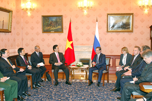 Trong khuôn khổ chuyến thăm chính thức Liên bang Nga, chiều 14/5 (giờ địa phương), tại Nhà khách Chính phủ ở Thủ đô Moscow, Thủ tướng Nguyễn Tẫn Dũng đã có cuộc gặp hẹp và hội đàm với Thủ tướng Liên bang Nga D. Medvedev.