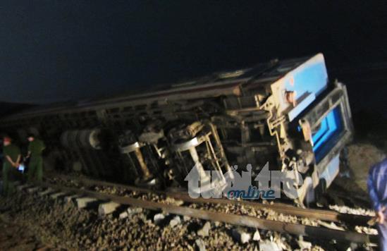 1g40. Hiện trường đã vãn người. Chủ yếu chỉ còn lực lượng cứu hộ gồm công an và công nhân đường sắt với hơn 100 người làm nhiệm vụ. Xe cẩu và đèn pha đã được huy động đến hiện trường để cẩu ba toa tàu bị lật.