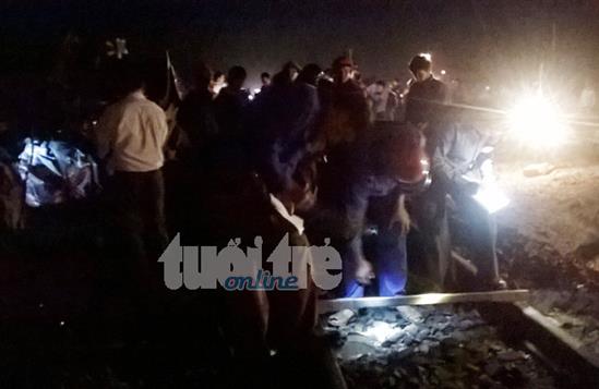 Chiếc xe tải nằm lật nghiêng bên đường ray, đá đổ ngổn ngang. Không thấy tài xế chiếc xe tại hiện trường.  Một đám đông hỗn loạn trong bóng tối, do chưa có nguồn ánh sáng nào đưa đến hiện trường.
