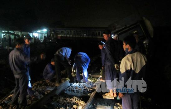 Lực lượng công nhân đường sắt hối hả sửa chữa sau tai nạn để đảm bảo thông suốt tuyến đường sắt Bắc Nam - Ảnh QUỐC NAM