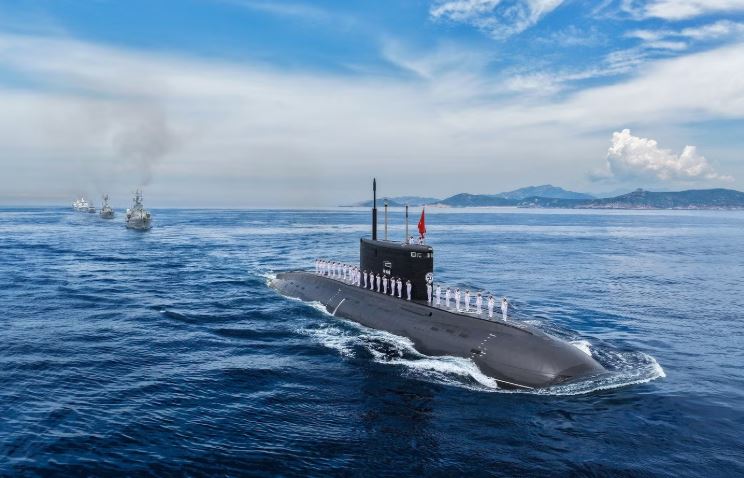 Tàu ngầm và tàu mặt nước của Hải quân nhân dân Việt Nam diễu binh trên biển.