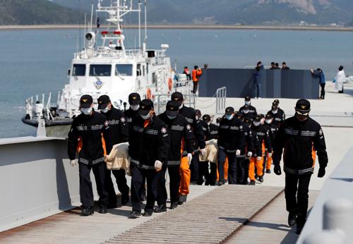 Thi thể nạn nhân được đưa lên đảo Jindo - Ảnh: Reuters