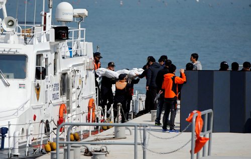 Các tàu lần lượt đưa thi thể nạn nhân bỏ trong túi đựng xác vào bờ ở đảo Jindo, trong tiếng khóc than và kêu gào từ thân nhân, theo mô tả của đài CNN (Mỹ) ngày 20.4.