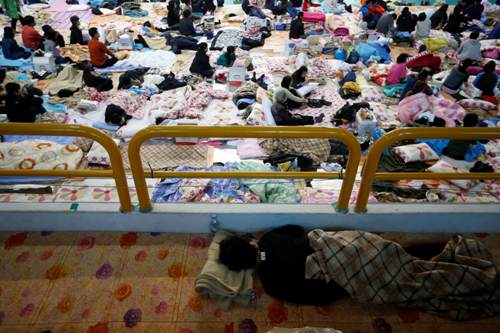 Thân nhân hành khách mất tích tá túc trong nhà thi đấu thể thao trên đảo Jindo - Ảnh: Reuters