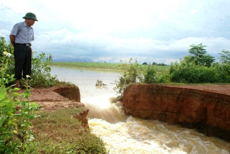 Mấy ngày qua, lượng mưa quá lớn khiến nước lũ dâng cao, tràn bờ gây ngập lụt. Tuyến đê chắn giữa sông Cầu Chày với xã Quảng Phú, huyện Thọ Xuân (Thanh Hóa) bị vỡ 3 đoạn khiến nhiều vùng mênh mông nước ngập.