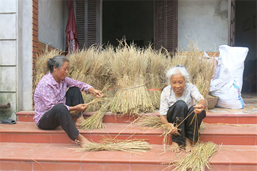 Hai chị em cựu TNXP đơn thân Nguyễn Thị Lụa và Nguyễn Thị Lược (Vũ Thư - Thái Bình) đan chổi để kiếm sống qua ngày