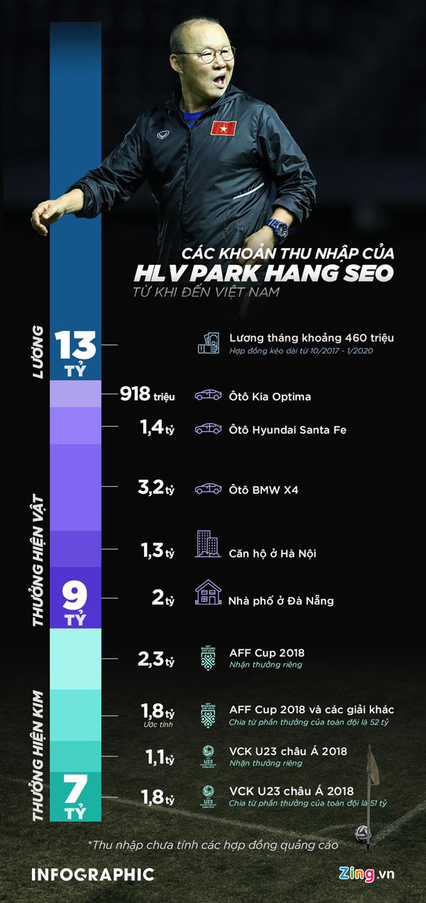 Chưa tính giá trị các hợp đồng quảng cáo không được công khai, tổng cộng lương, thưởng tiền mặt, nhà và xe được tặng của HLV Park Hang-seo trong 2 năm qua lên tới gần 30 tỷ đồng.