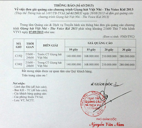 Bảng giá quảng cáo đêm CK The Voice Kids được VTV công khai