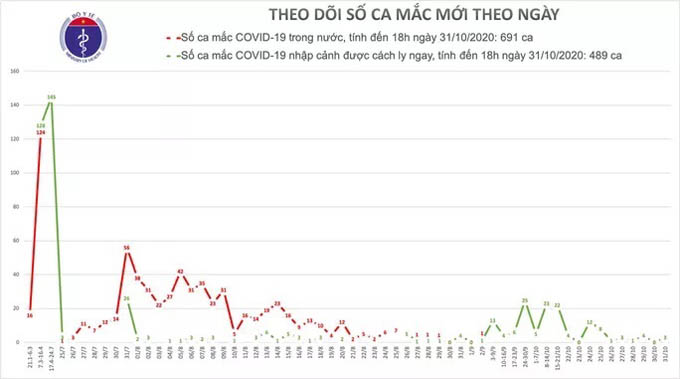 Chiều 31-10, Việt Nam ghi nhận thêm 3 ca mắc Covid-19 là người nhập cảnh được cách ly tại Khánh Hoà và Đà Nẵng. Việt Nam hiện có 1.180 ca bệnh.