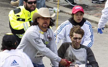 Hai phút rưỡi sau, chiếc túi phát nổ và khiến 2 chân anh bị xé nát. Một bức ảnh được đăng tải sau đó cho thấy anh ngồi trên xe lăn, người đầy máu, mặt sạm đen và được 2 người qua đường đưa đi cấp cứu.