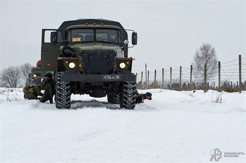 Các binh sĩ triển khai đội hình bảo vệ đoàn xe hành quân khi có tình huống đối phương phục kích bất ngờ.