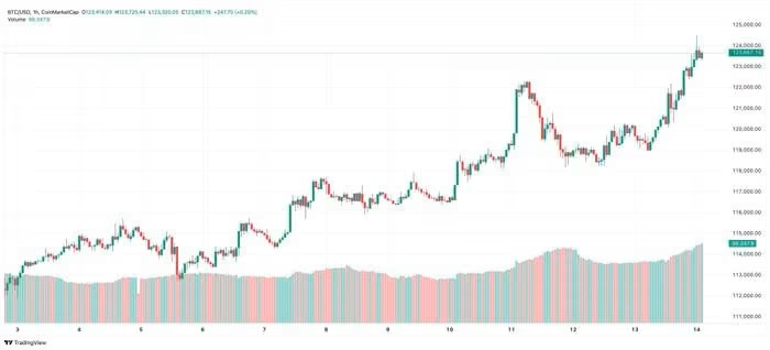 Sáng 14/8 theo giờ Việt Nam, Bitcoin - đồng tiền số giá trị nhất thế giới - tăng 3,6% lên 123.800 USD, vượt qua mức đỉnh trước đó đạt được hồi đầu tháng 7. Ether, đồng tiền điện tử lớn thứ hai cũng chạm ngưỡng 4.780 USD - mức cao nhất kể từ cuối năm 2021.