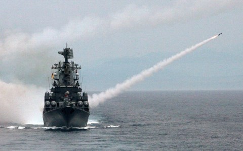 Soái hạm Moskva của Hạm đội Biển Đen của Hải quân Nga đã được điều đến Địa Trung Hải để bảo vệ căn cứ và các máy bay của Không quân Nga ở Syria. Ảnh RT