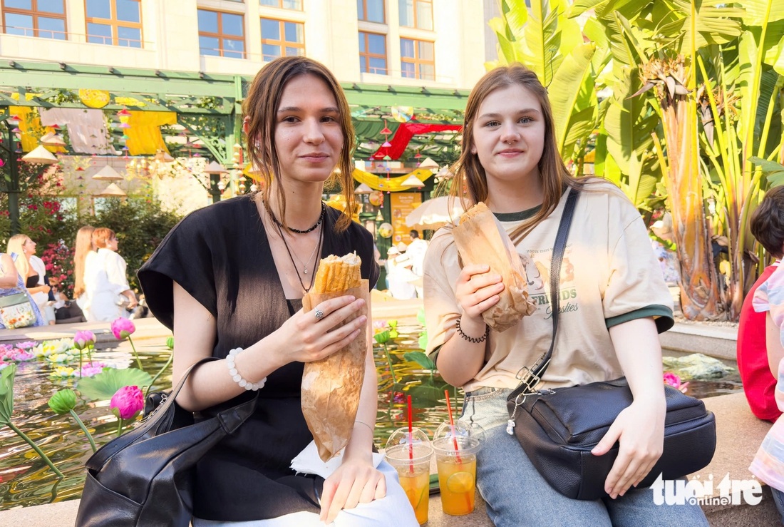 Hai bạn trẻ Rina Parson và Valery Sherman no căng với bánh mì Việt Nam - Ảnh: NGUYỄN KHÁNH.