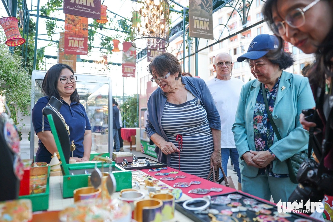 Nhiều du khách Nga tìm hiểu vẻ đẹp tinh tế của các sản phẩm sơn mài Việt Nam - Ảnh: NGUYỄN KHÁNH