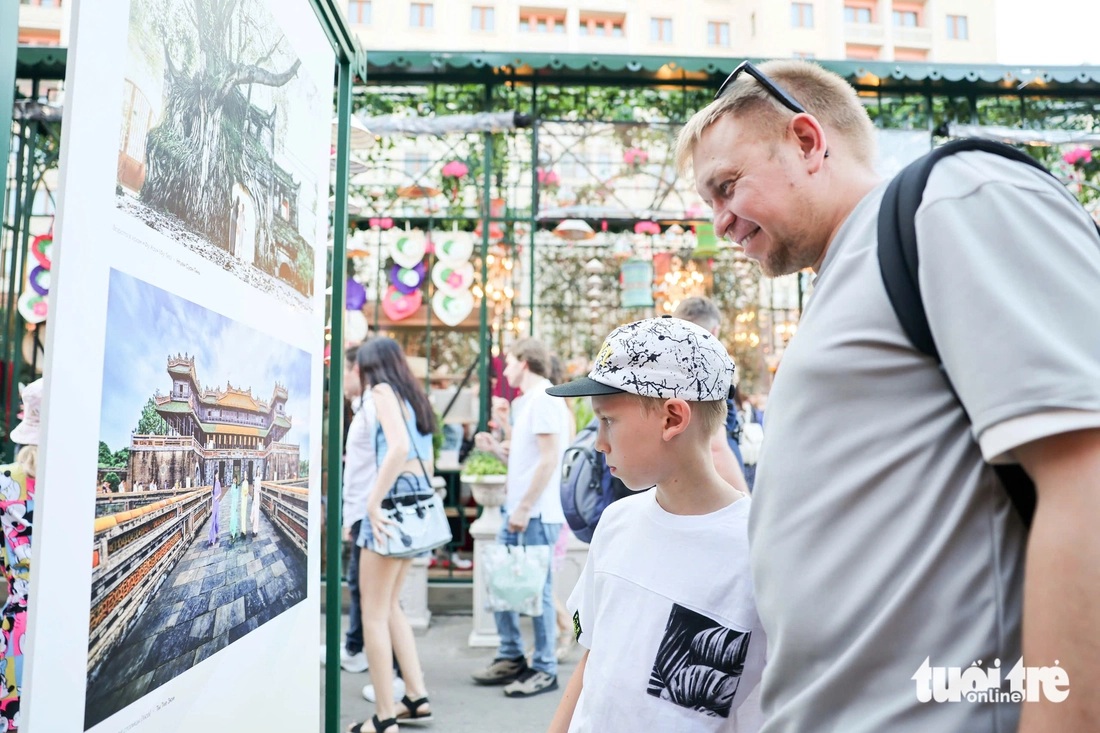 Hai cha con người Nga "du lịch Việt Nam" qua triển lãm ảnh tại lễ hội - Ảnh: NGUYỄN KHÁNH