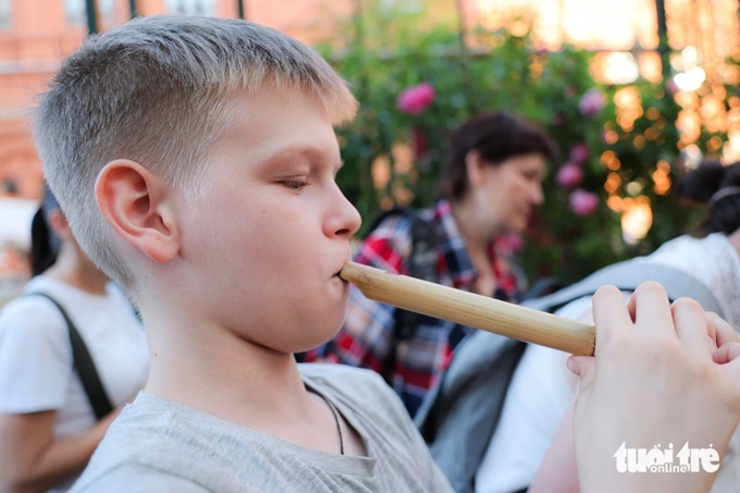 Một cậu bé người Nga thử chiếc sáo trúc Việt Nam - Ảnh: NGUYỄN KHÁNH.