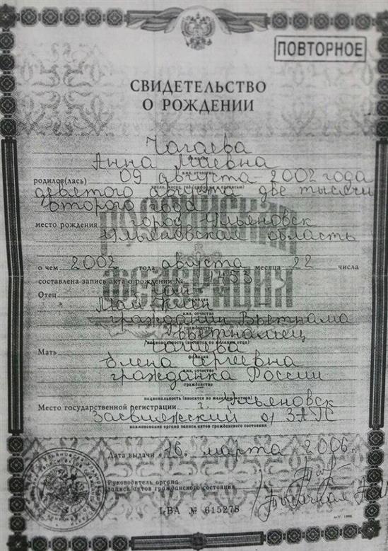 Bản sao giấy khai sinh của cháu Anna Chageva Maevna