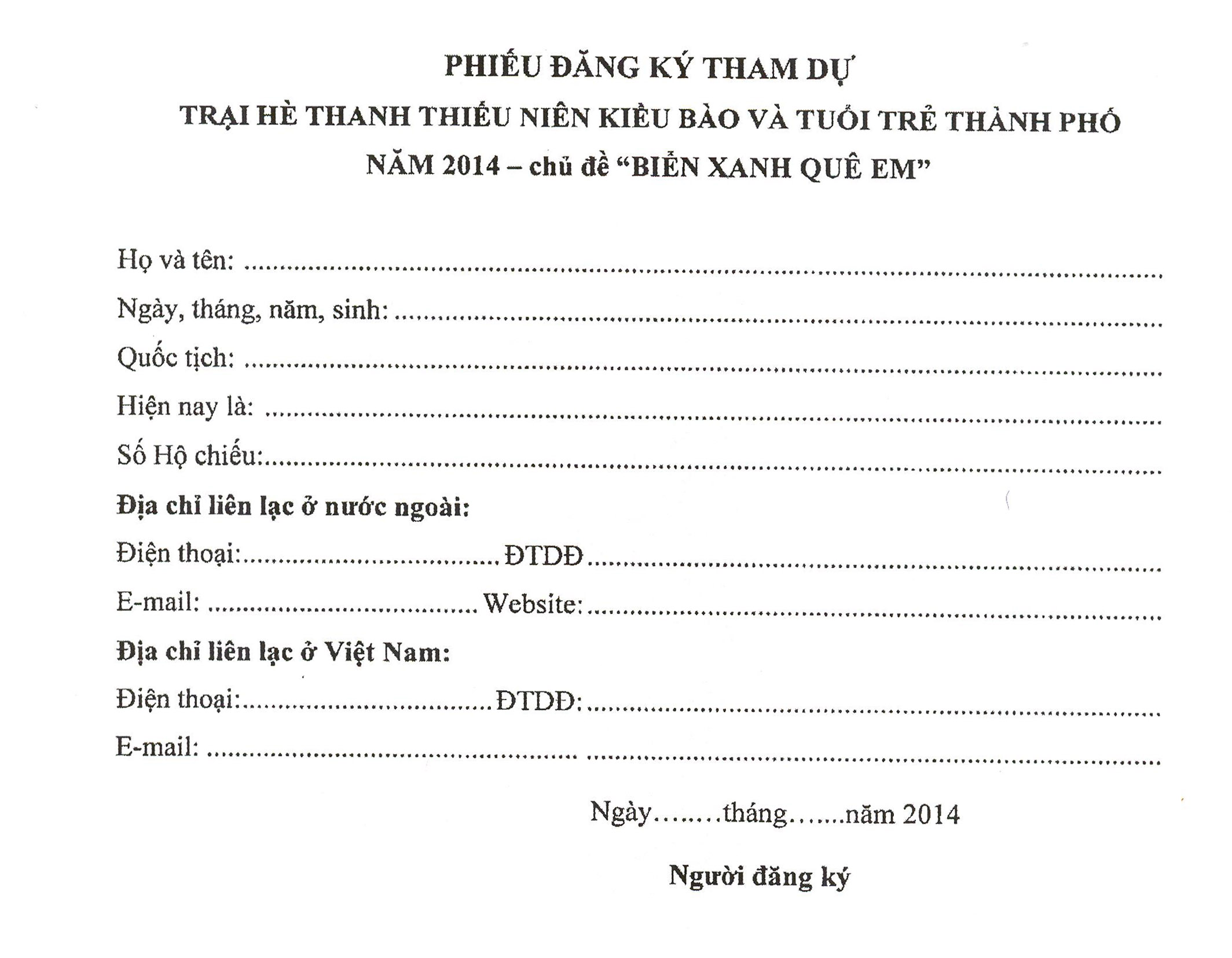 Phiếu đăng ký tham dự “Trại hè thanh thiều niên kiều bào và tuổi trẻ TP. Hồ Chí Minh” năm 2014 với chủ đề " Biển xanh quê em"