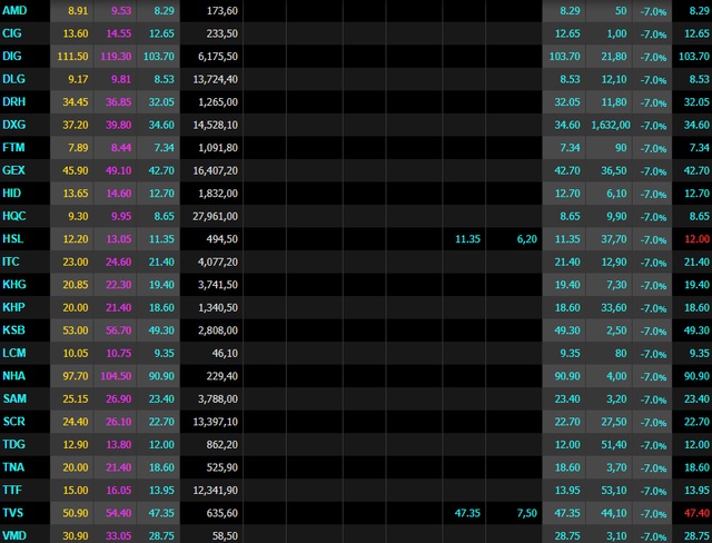 Cổ phiếu "họ FLC" như FLC, ROS, AMD, HAI, ART, KLF… cũng chìm sâu trong mức giá "xanh sàn" với hàng chục triệu cổ phiếu được "chồng chất" bán sàn ngay từ những phút đầu phiên, song khối lượng khớp lệnh chỉ được vài trăm nghìn đơn vị trong toàn bộ thời gian giao dịch.