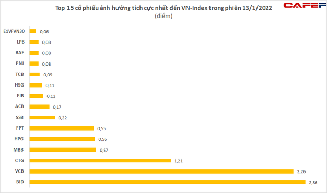 Thống kê trên HoSE, 15 cổ phiếu tác động tích cực nhất tới VN-Index có sự đóng góp lớn bởi 9 mã ngân hàng, có thể kể tới là BID ( 2,36 điểm), VCB ( 2,26 điểm), CTG ( 1,21 điểm), MBB ( 0,57 điểm), SSB ( 0,22 điểm), ACB ( 0,17 điểm), EIB ( 0,12 điểm), TCB ( 0,09 điểm), LPB ( 0,08 điểm). Ngoài ra, hai ông lớn HPG và HSG của ngành thép tăng điểm tốt qua đó đóng góp 0,56 điểm và 0,11 điểm cho Index.