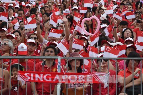 Người dân Singapore vẫy quốc kỳ tại lễ kỷ niệm 50 năm Ngày Quốc khánh ở Padang. Ảnh: AFP/TTXVN